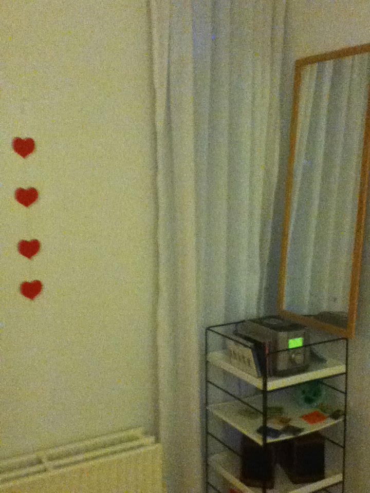 So, this past week I went home to visit mormor and morfar, which was very nice. Mormor found my favorite type of pastry, and morfar fixed my skirt zipper and found a ton of tourist catalogs to help me figure out what I want to do with Kevin and Amanda when they come. Also, I got my mom's old bedspread in the mail; it is COVERED in red hearts, big and small, and thus is perfect for my room. So naturally I had to paint my nails to match. They look like hooker nails though, so I decided to enjoy the act of picking all the polish off. Plus I now have a really comfy new desk chair (also red) that Pernille is storing in my room for the semester.