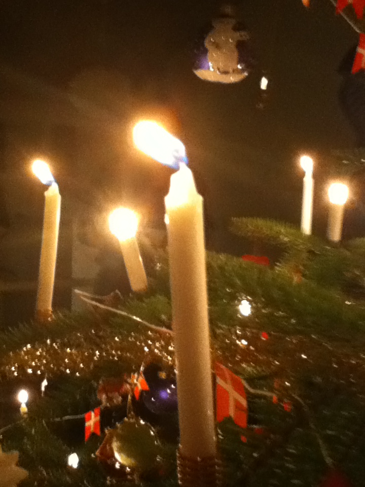 We had a traditional Danish Christmas tree, which means real live candles instead of lights, and flags on the tree.